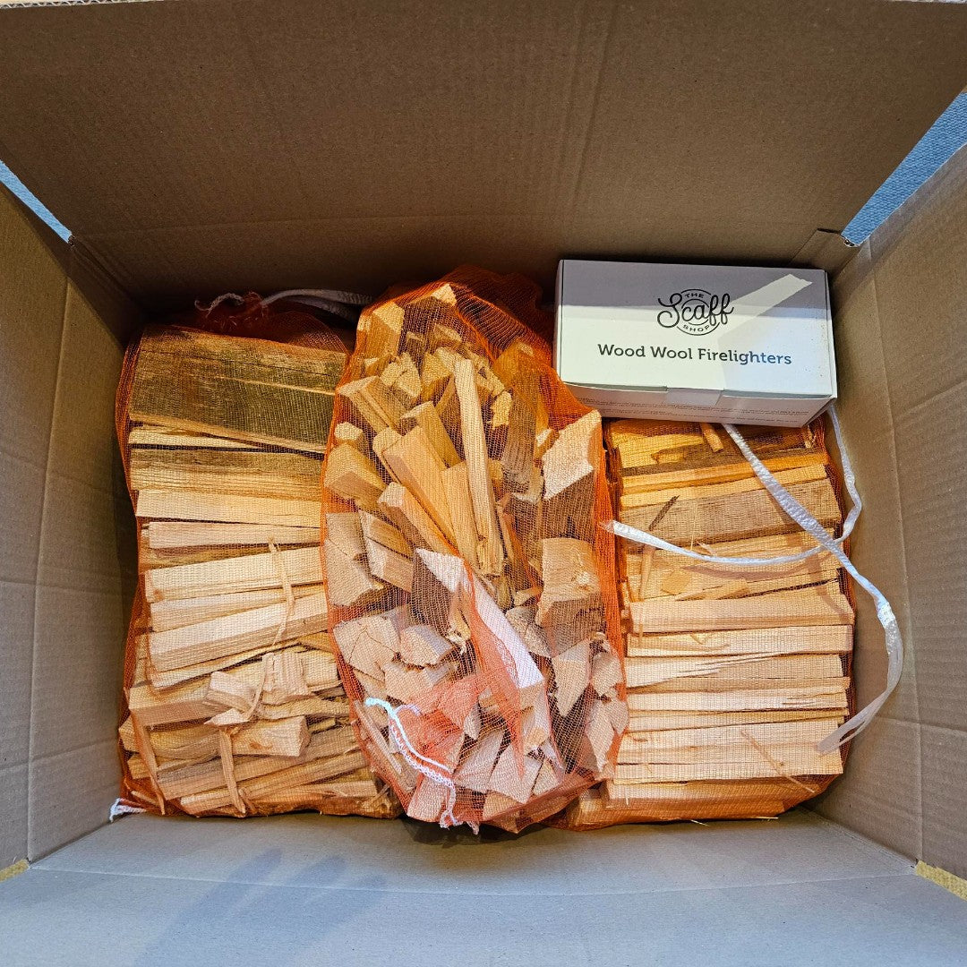 All of our kindling comes from damaged boards that would otherwise be considered waste. The damaged sections are removed , sized, and put through a kindling chopping machine which makes them in to the handy size that they arrive to you in.